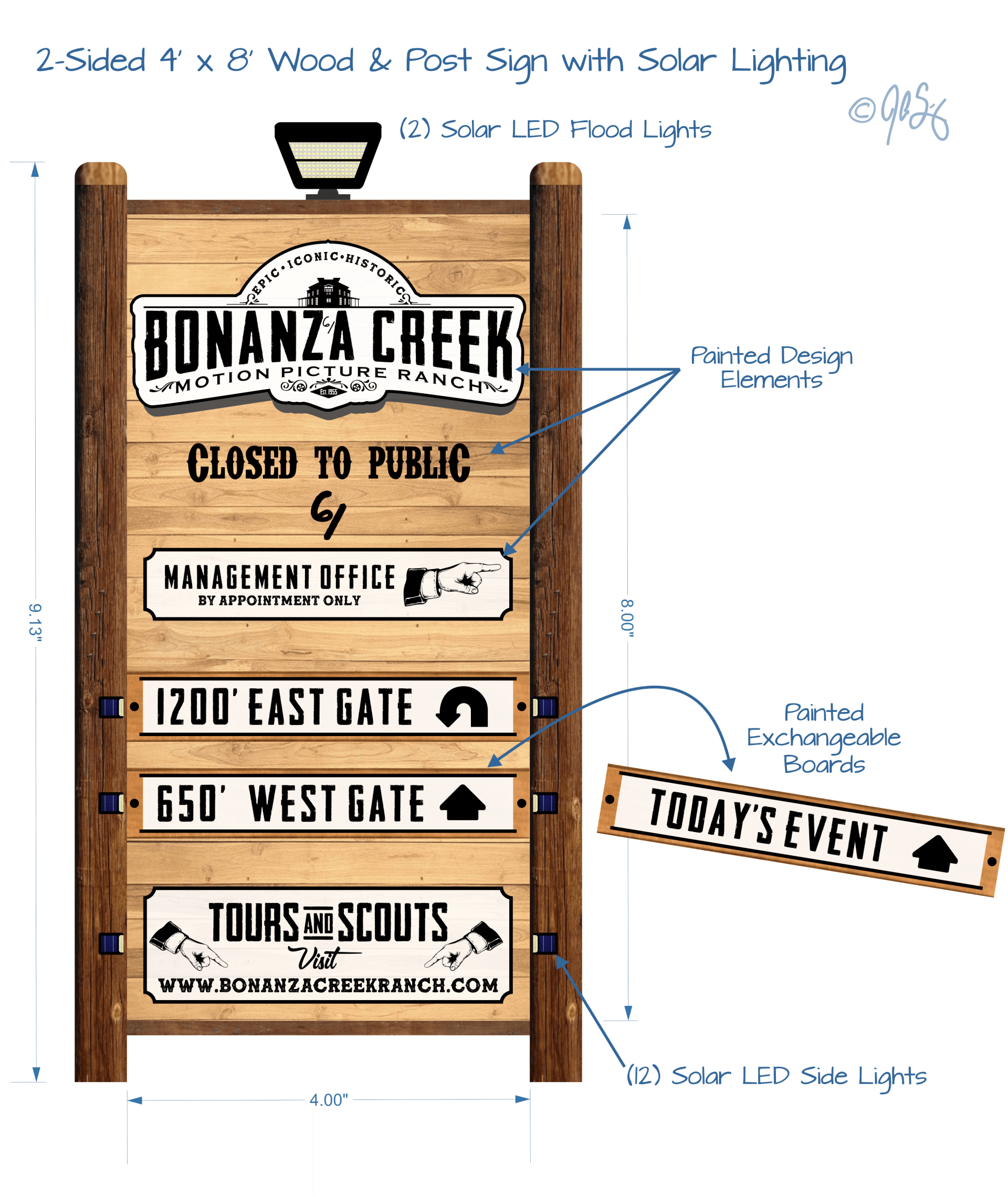 Signs. Imogene, the image gallery is to the right. In it you will find concept designs for a 4'x4' sign and 4'x8' vertical sign. Both are double sided and include solar lighting. I added them to photos to help picture them. Obviously they can be placed anywhere. Also any aspect of the design can be changed.