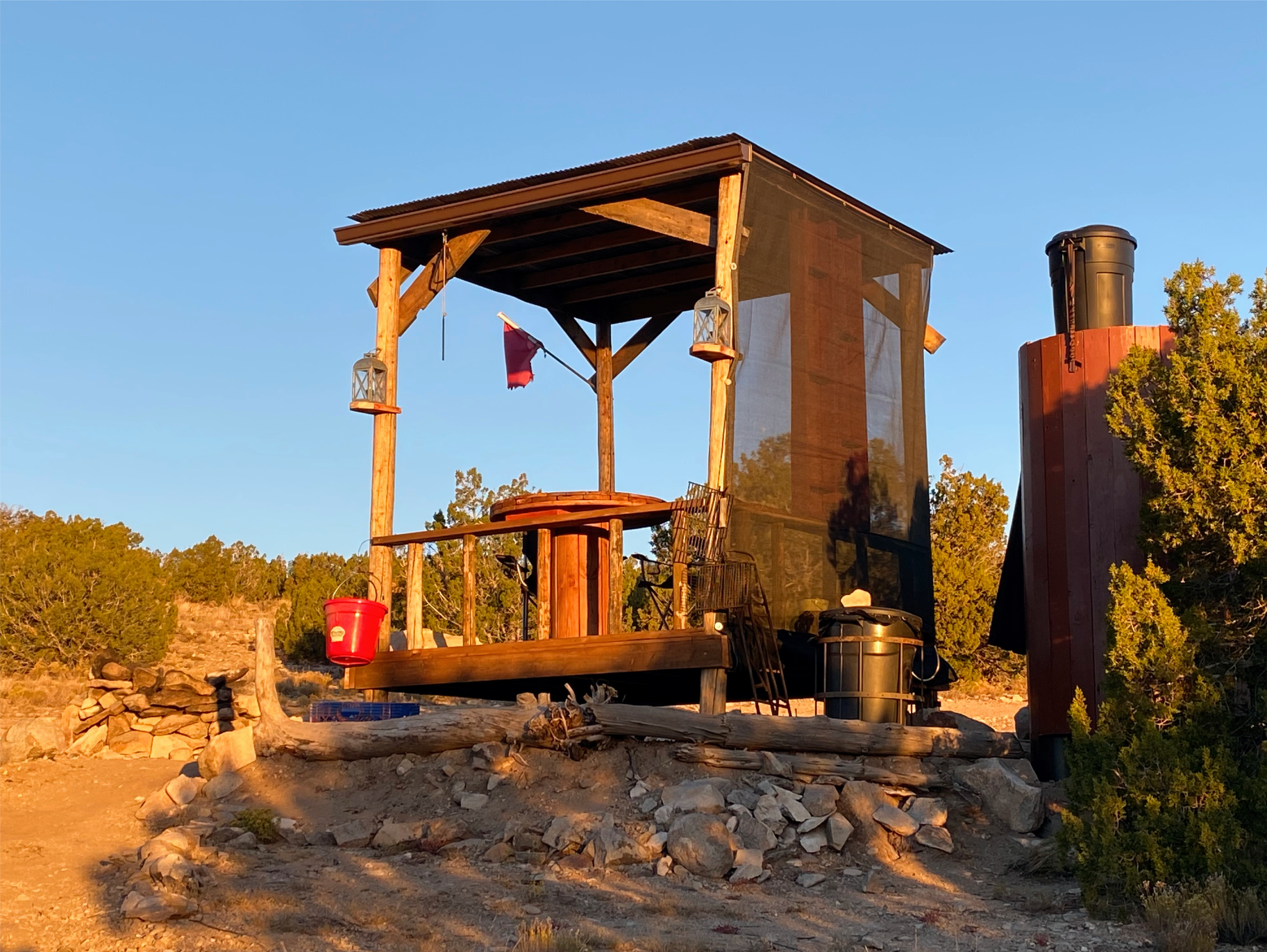 ABOUT LATRINE: The uber-clean latrine is within a private enclosure. Below the toilet seat within a self-enclosed base is a bio-waste bag lined bucket. Access to the based is behind the latrine: simply remove the sanitized bucket, add bio-wast liner, use the small shovel to fill bag with 1/4in of desert sand. Guests are responsible for disposing their biowaste off property. The latrine is cleaned and santized after guest check-out and again the day of guest arrival. Bio-Waste liners and bathroom tissue is a provided amenity.